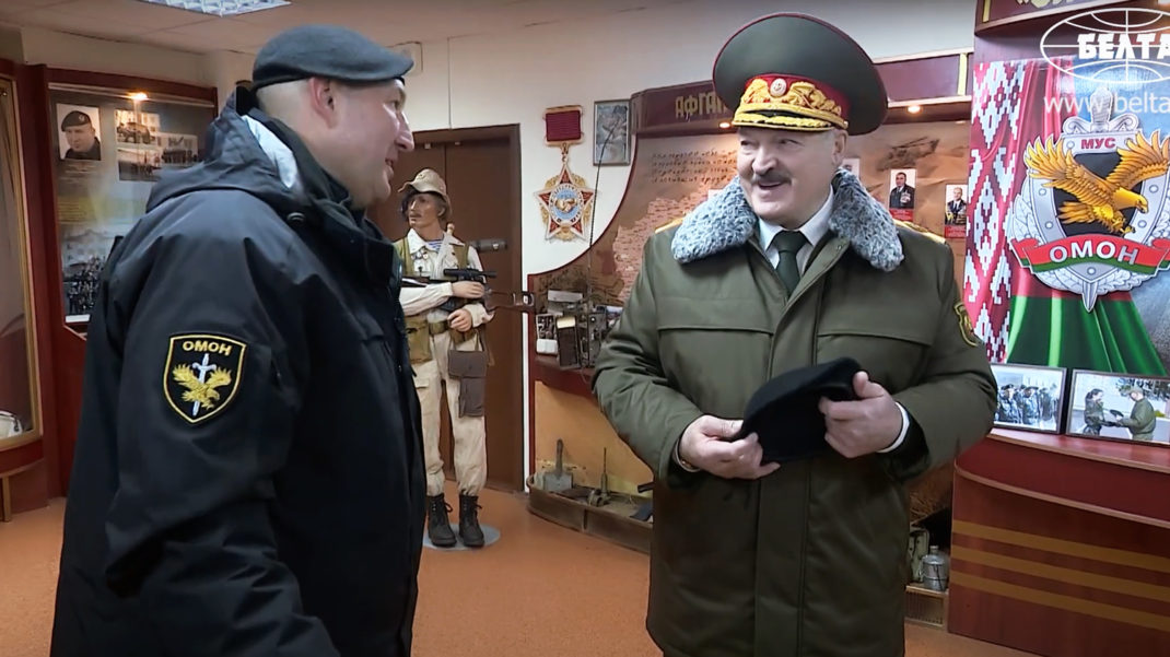 «Вы были с нами в боевых порядках, и теперь вы полноценный боец ОМОНа», — объявил президенту командир минского ОМОНа Дмитрий Балаба. Лукашенко в ответ пошутил, что вряд ли сдаст необходимые испытания на право ношения такого берета. Но Балаба заверил, что знак отличия был вручëн главе государства «за особые заслуги».