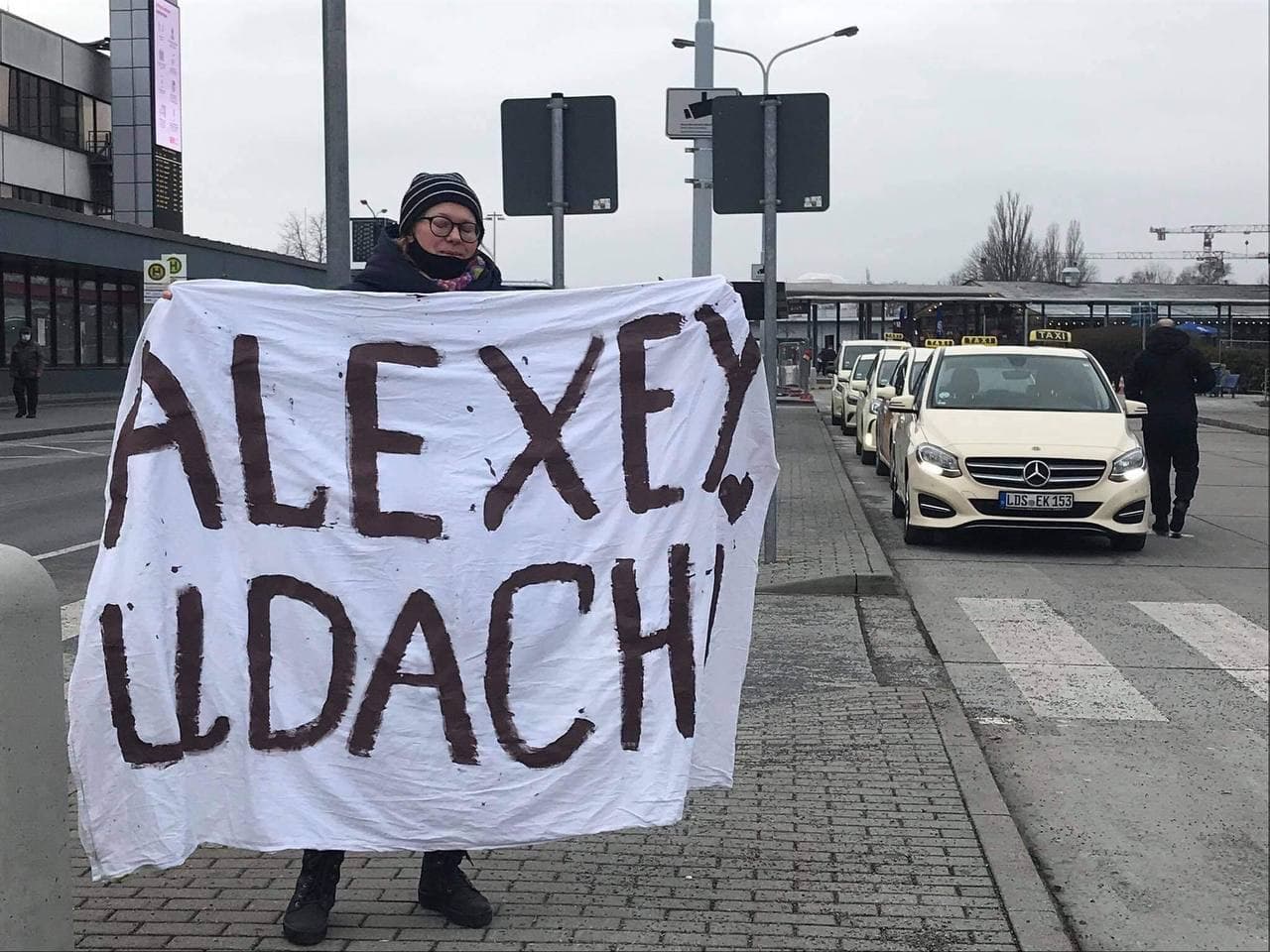 - К терминалу также пришли активисты с различными плакатами и транспарантами с надписями: «Алексей, удачи» на латинице и русском языке.