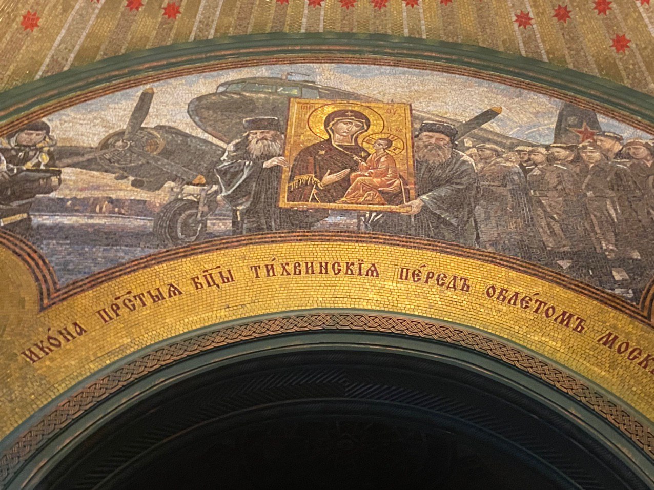 Мозаика над главными вратами в верхний храм посвящена облёту Москвы с иконой Тихвинской Божией Матери в 1941 году, правда, никаких убедительных свидетельств того, что такой ритуал действительно был проведён, не существует. Маловероятно, что это произошло в реальности: в то время сталинский СССР активно боролся с РПЦ, закрывая храмы, отправляя в ссылку или расстреливая священников; примирение же церкви и советского государства состоялось только к концу 1943 года.