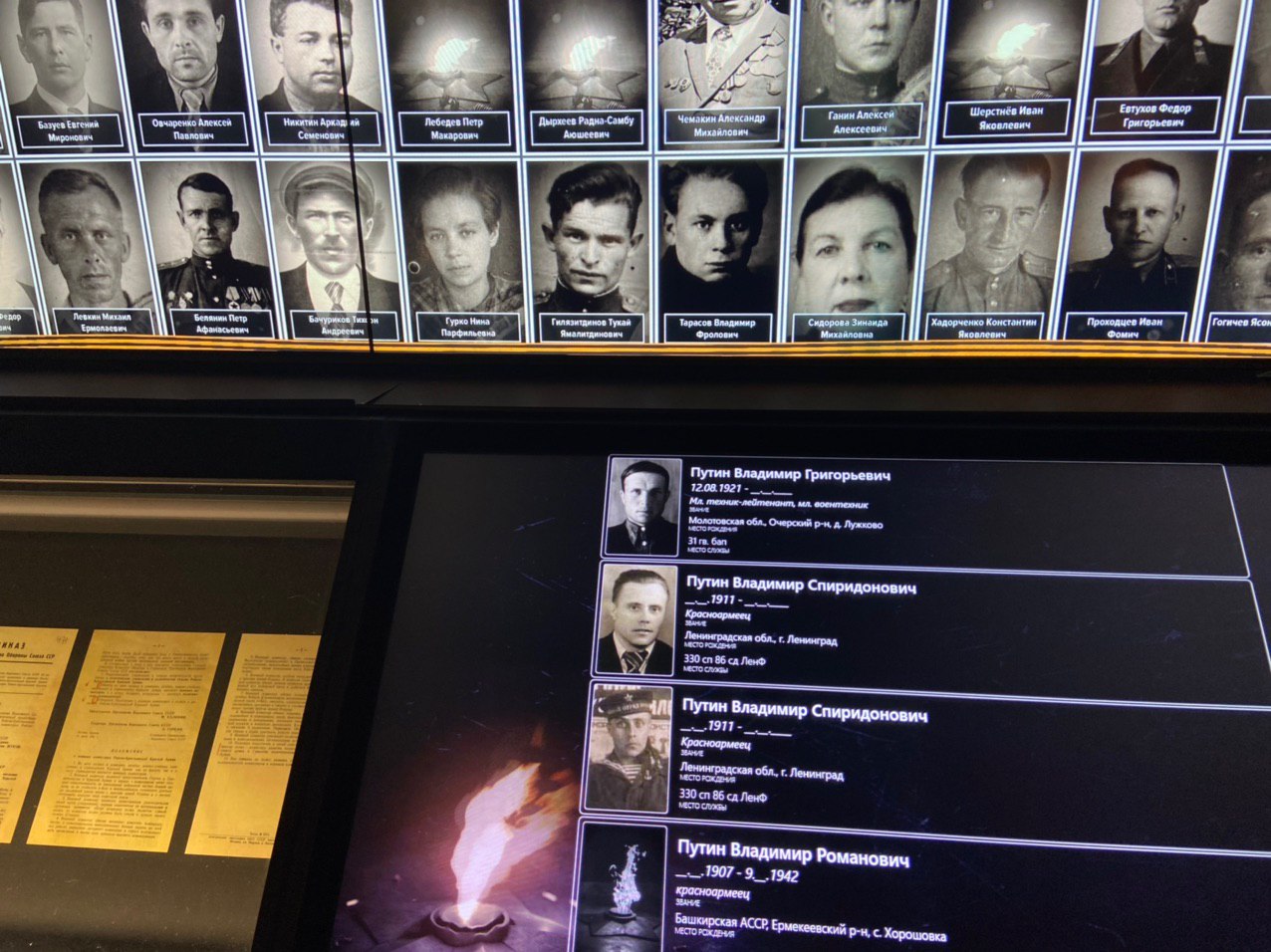 Почему-то дважды в этом перечне встречается отец президента Путина — Путин Владимир Спиридонович. Два бойца Путина — два разных фото, но ссылка ведёт на одну и ту же архивную запись. Эта запись содержит и наградной лист, описывающий подвиг, за который Путин-старший получил медаль «За боевые заслуги»: 17-ого ноября 1941 года под станцией Невская Дубровка в составе 330-го стрелкового полка он при наступлении получил тяжёлое осколочное ранение в левую голень, стопу с переломом большой берцовой кости, в результате чего стопа не гнётся.