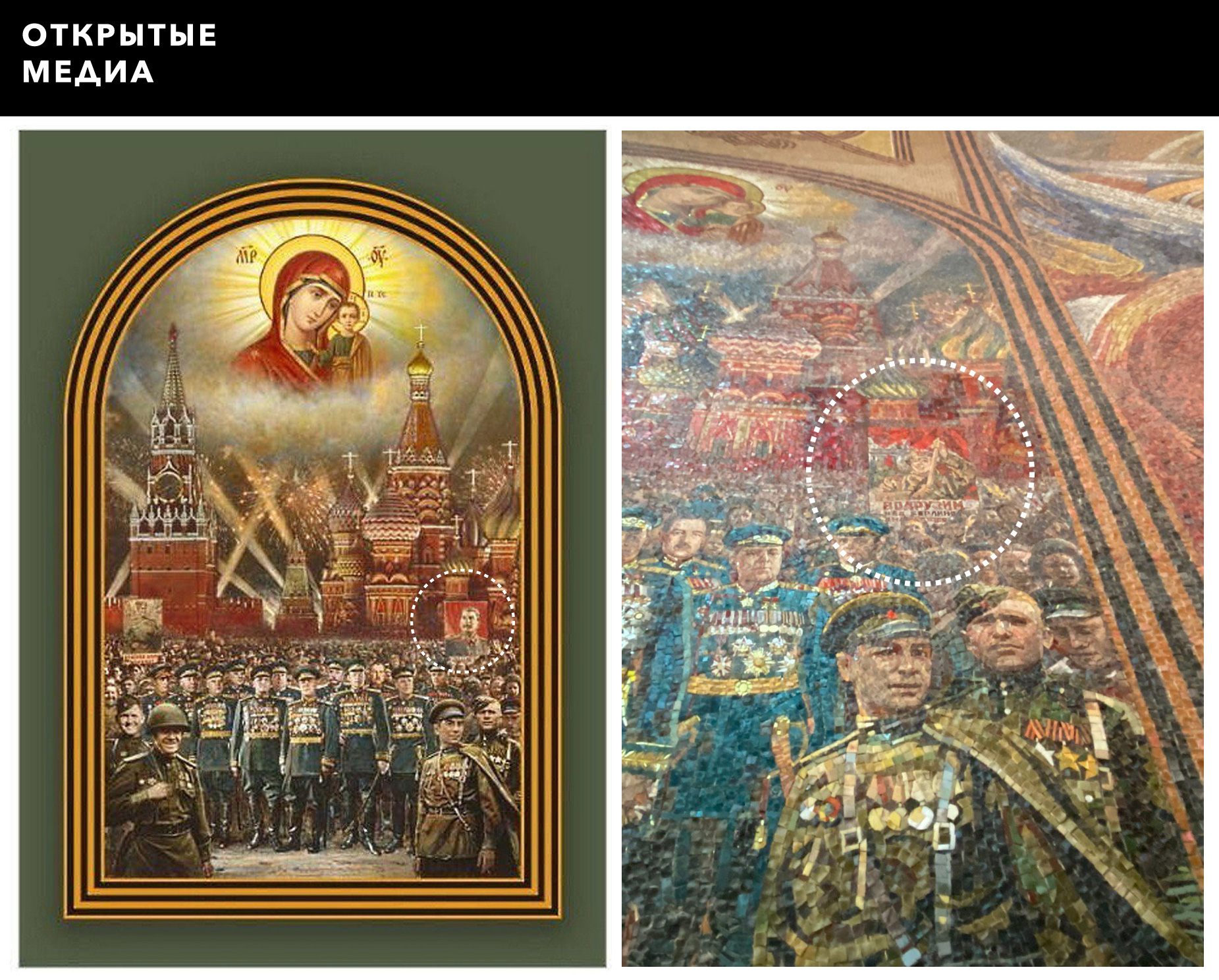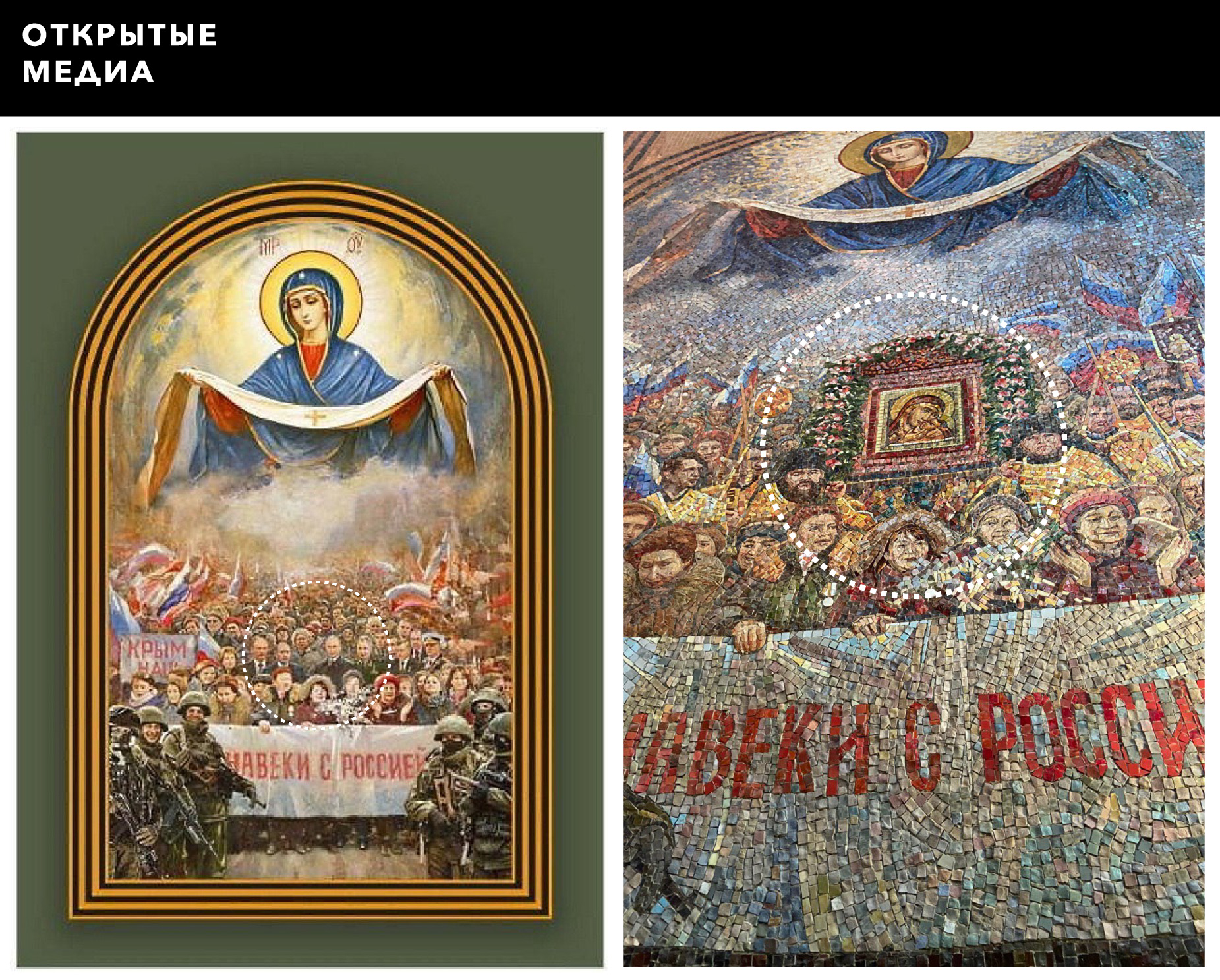 Лица российских чиновников были в центре мозаики, посвящённой присоединению Крыма к России. Теперь на том же самом месте располагаются изображения священников. А там, где раньше располагалась голова Владимира Путина, теперь красуется икона, которой в первоначальном варианте картины не было.
