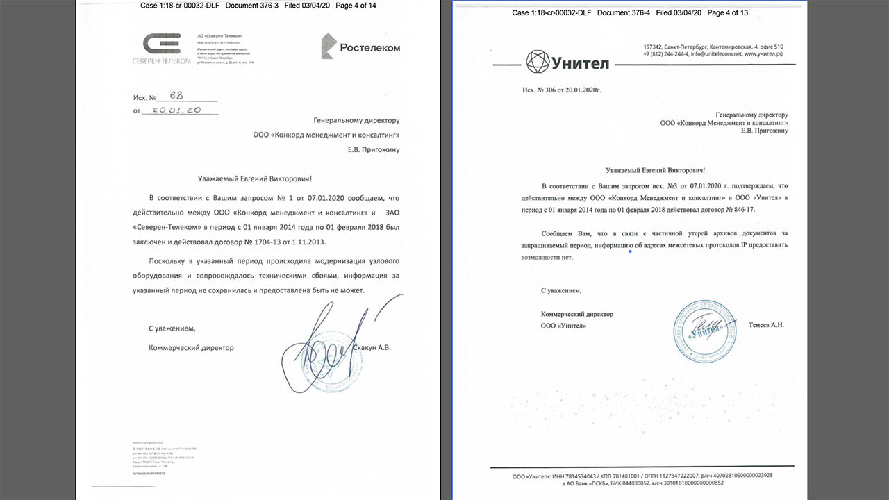 Отвечая на вопрос об IP-адресах, которые использует «Конкорд», Пригожин пишет, что обратился к провайдерам с просьбой предоставить необходимую информацию. Однако те ответили бизнесмену, что потеряли нужные данные и ничего предоставить не могут. Компания «Юнител» заявила, что у неё произошла «частичная потеря архивов документов». А «Северен телеком», дочерняя структура государственного «Ростелекома», объяснила утрату данных «техническими сбоями при модернизации оборудования».