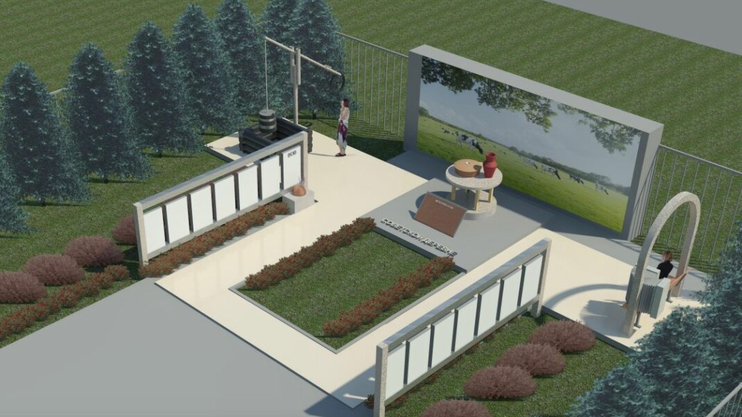Судя по изображениям в закупочной документации, в посёлке Первомайский на улице Болотной разобьют небольшой сквер, сделают макет колодца и скамейку с баяном. В центре композиции установят крынку с молоком, каравай с солью и фотозону с коровами. Создание памятника обойдётся в 1,5 млн рублей. Финансировать строительство будут из краевого и местного бюджетов.
