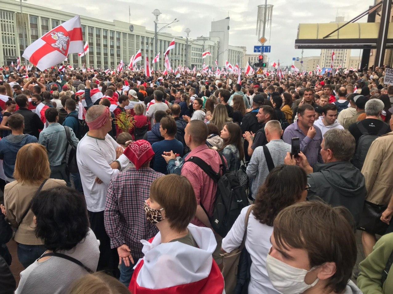 Через час не менее 200 тысяч человек собрались на обширной площадке возле гостиницы «Планета», они ждали заявлений лидеров протеста, но никакого выступления представителей КС не было. Потом прошла информация, что сотрудники КГБ заблокировали провоз звукоусилительной аппаратуры, поэтому выступления соратников Тихановской не будет.