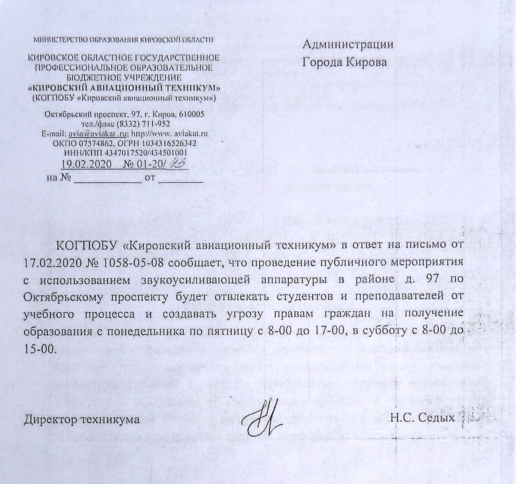 В этих письмах руководители школы, авиационного техникума и сельскохозяйственной академии, которые находятся на пути предполагаемого маршрута марша, написали почти слово в слово: «Проведение публичного мероприятия с использованием звукоусиливающей аппаратуры будет отвлекать студентов и преподавателей от учебного процесса и создавать угрозу правам граждан на получение образования».