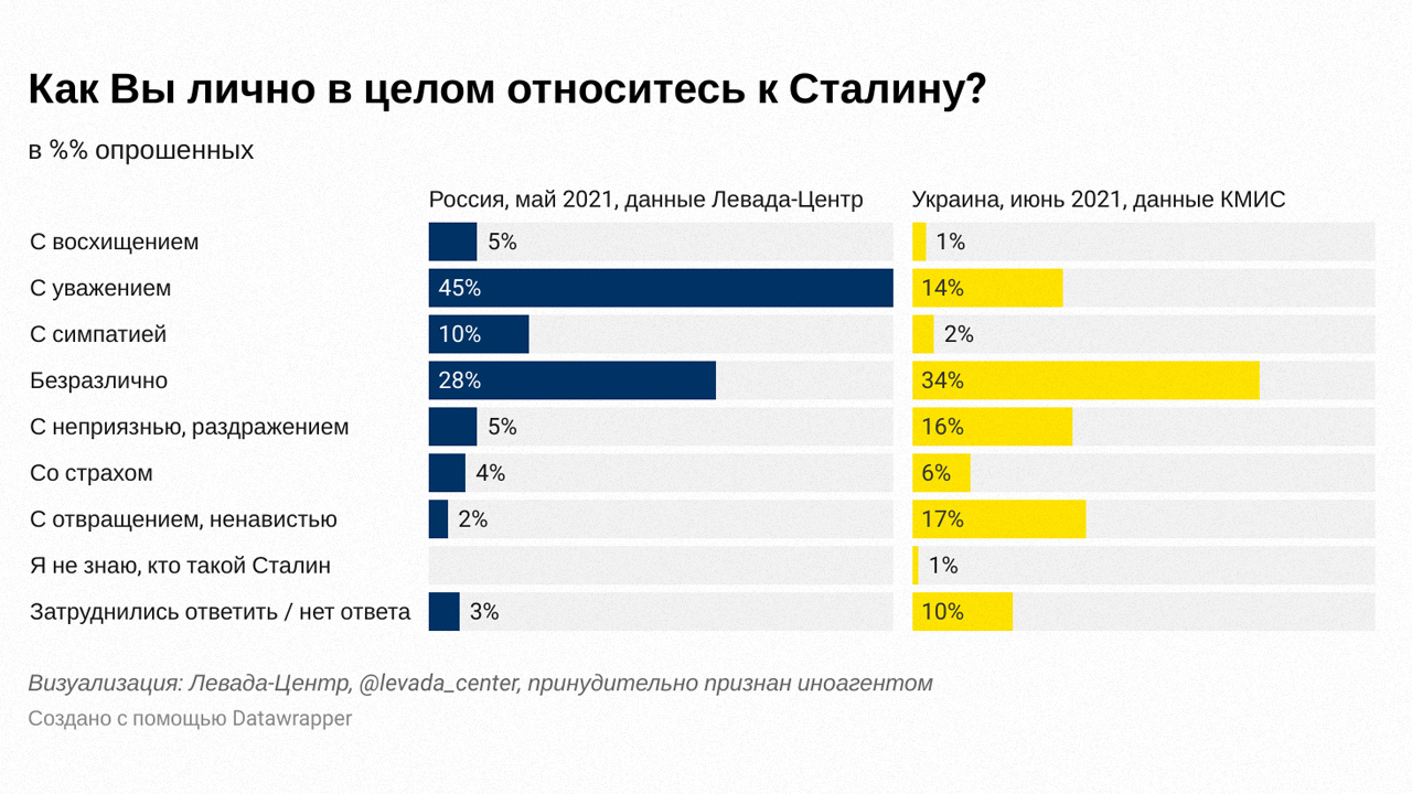 Россияне демонстрируют максимальный уровень уважения к фигуре Иосифа Сталина с 2001 года — сейчас об уважении к нему в ходе майского опроса «Левада-центра"* заявили 45% респондентов, тогда как 20 лет назад об уважении говорили 27%. Совсем другие чувства сегодня испытывают к генсеку украинцы.