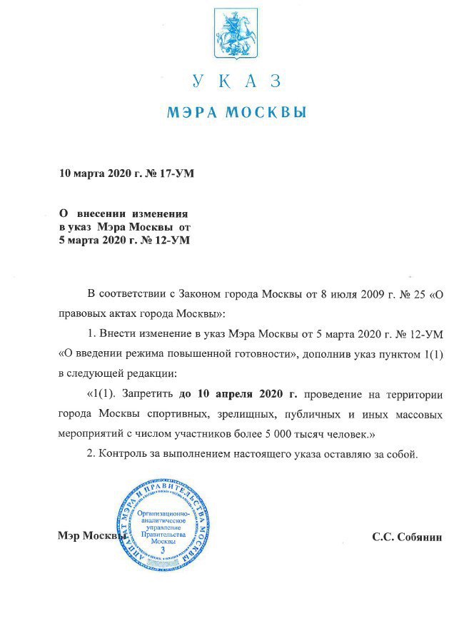 Сегодня, 10 марта, мэр Москвы Сергей Собянин подписал указ, запрещающий на территории Москвы проведение мероприятий с числом участников более 5000 человек. Запрет связан с распространением в столице коронавируса и продлится до 10 апреля.