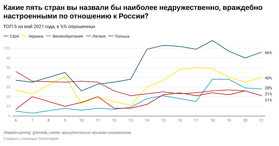 83% россиян считают, что у страны есть враги. Главной недружественной страной для России опрошенные считают США. Увеличился уровень недоверия и к Украине — ее назвали 40% респондентов. Также в первую десятку попали Великобритания, Латвия, Литва, Эстония, Польша, Германия, Грузия и Чехия. Отношение к Европейскому Союзу также продолжает ухудшаться. В январе 2021 года 45% респондентов положительно относились к ЕС, 37% — отрицательно. В марте эти показатели составили 38% и 45% соответственно.