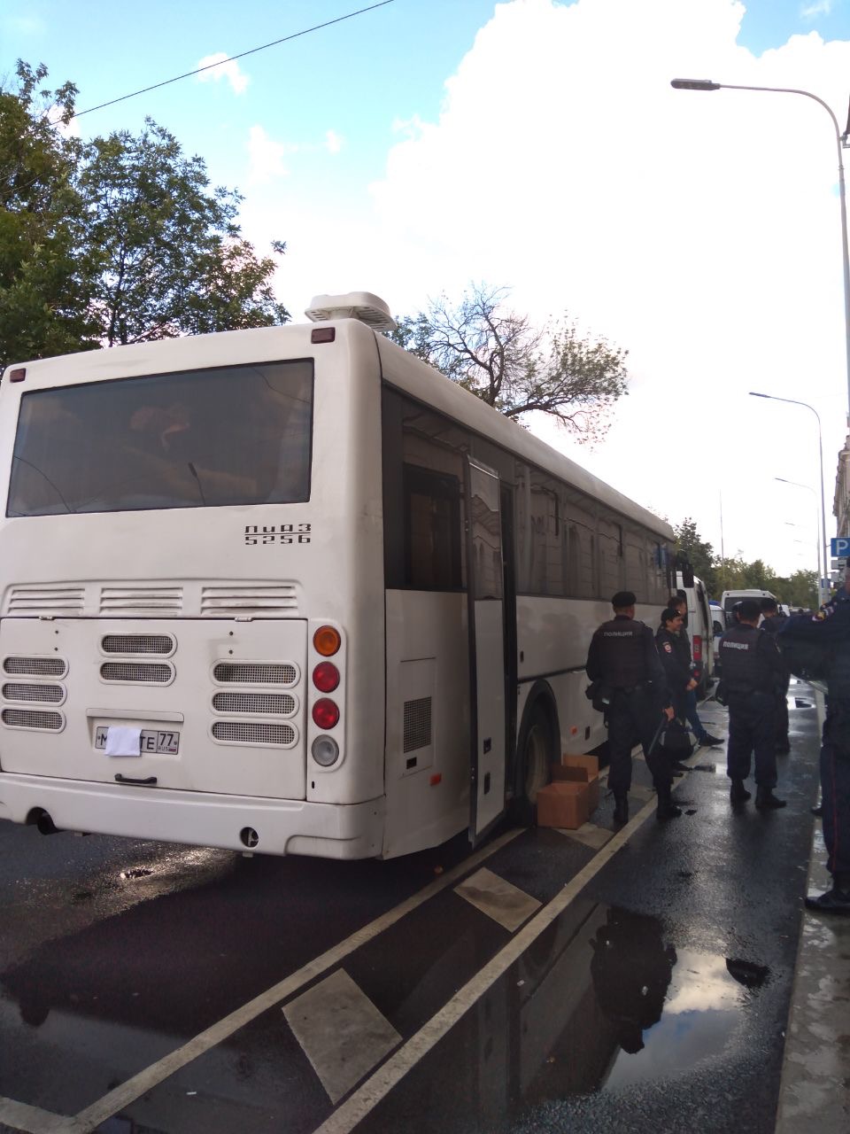 К вечеру у ОМОНовцев, видимо, закончились автозаки, потому что подогнали обычные автобусы — у них были закрыты номера (см. фото).