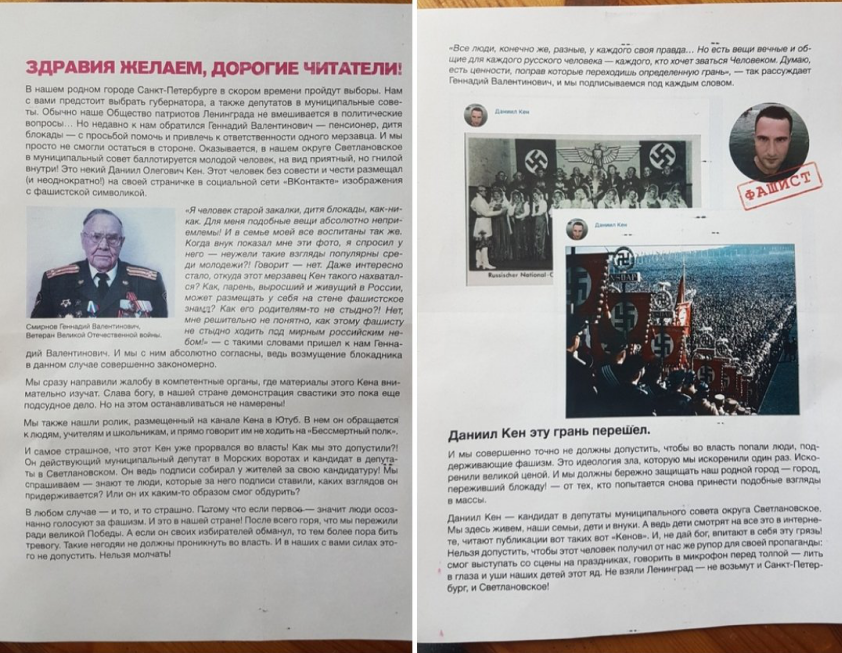 В листовке говорилось, что Кен размещал на своих страницах в соцсетях фотографии с фашисткой символикой. Якобы это заметил блокадник, ветеран Великой отечественной войны Геннадий Валентинович Смирнов.
