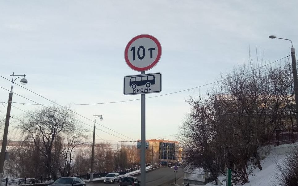 Запрещающий знак перед мостом не разрешает ездить по этому мосту любому транспорту массой больше 10 тонн. Однако добавленный к нему знак делает исключение для проезда более тяжёлых автобусов. Девять таких автобусов марки «Волгобас» муниципальный перевозчик закупил в декабре 2018 года. Предполагалось, что они заменят городские электрички, которые местная администрация планирует полностью отменить.