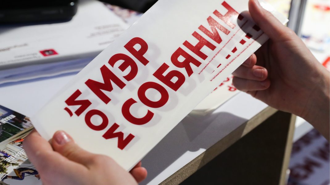 MOSCOW, RUSSIA — AUGUST 15, 2018: Promotional signs in the campaign headquarters of the incumbent mayor of Moscow, Sergei Sobyanin (not in picture); Moscow is to hold a mayoral election in September 2018; the message reads: Sobyanin is my mayor. Sergei Savostyanov/TASS Ðîññèÿ. Ìîñêâà. Íàêëåéêè â ïðåäâûáîðíîì øòàáå êàíäèäàòà â ìýðû Ìîñêâû Ñåðãåÿ Ñîáÿíèíà. Ñåðãåé Ñàâîñòüÿíîâ/ÒÀÑÑ