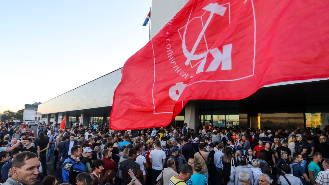 VLADIVOSTOK, RUSSIA — SEPTEMBER 17, 2018: People take part in a rally in support of Primorye Territory Gubernatorial candidate from the Russian Communist Party (KPRF) Andrei Ishchenko outside the offices of the Primorye Territory administration. Ishchenko has launched a hunger strike after the second round of the 2018 Primorye Territory Gubernatorial election. Anton Balashov/TASS Ðîññèÿ. Âëàäèâîñòîê. Ó÷àñòíèêè ñòèõèéíîãî ìèòèíãà â ïîääåðæêó êàíäèäàòà â ãóáåðíàòîðû Ïðèìîðñêîãî êðàÿ îò ÊÏÐÔ Àíäðåÿ Èùåíêî, îáúÿâèâøåãî î áåññðî÷íîé ãîëîäîâêå â çíàê ïðîòåñòà ïðîòèâ ðåçóëüòàòîâ ïîäñ÷åòà ãîëîñîâ âî âòîðîì òóðå âûáîðîâ, ó çäàíèÿ àäìèíèñòðàöèè Ïðèìîðñêîãî êðàÿ. Àíòîí Áàëàøîâ/ÒÀÑÑ