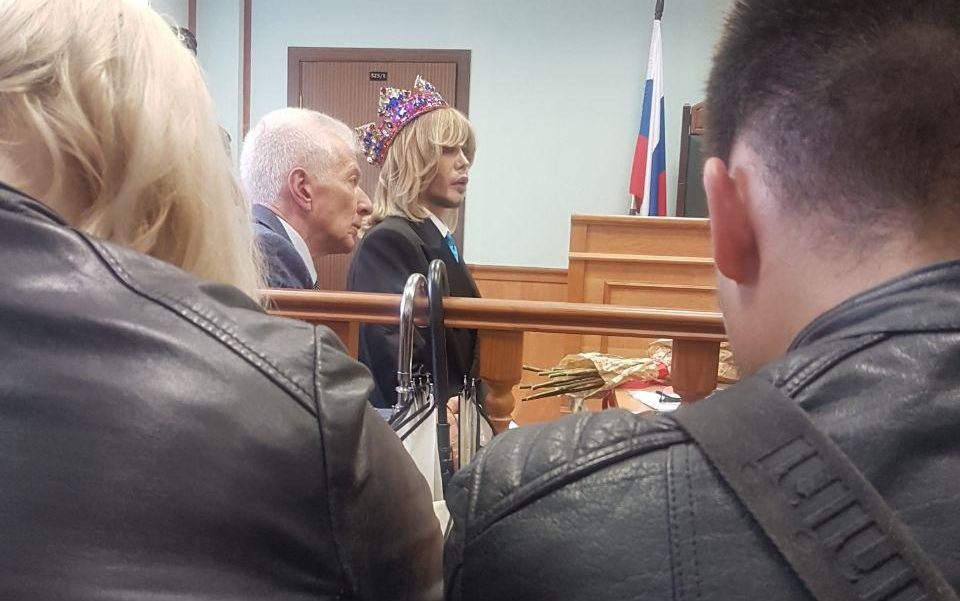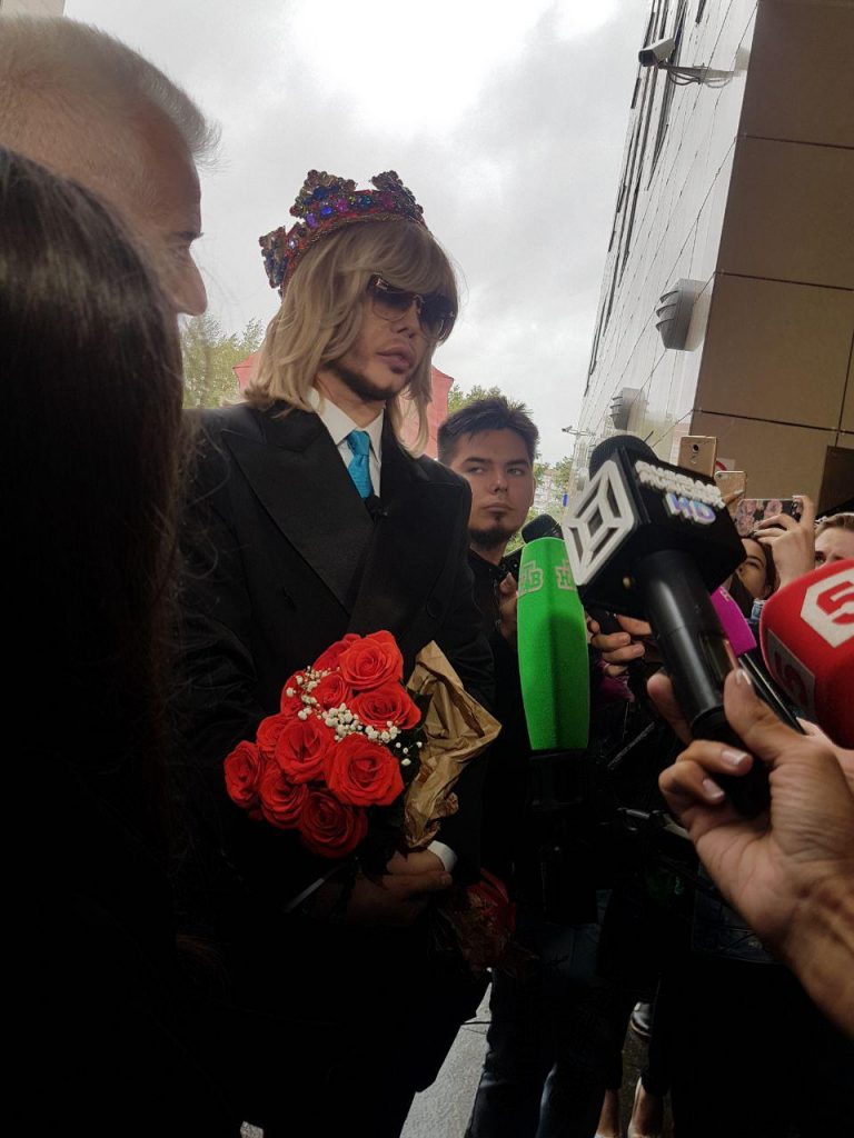 Сегодня в Мосгорсуд Зверев вошел без короны, но с букетом красных роз, которые подарил ему поклонник. Впрочем, в зале заседания он достал из сумки корону и надел её. Она отличалась от той, в которой стилист был на прошлом заседании, большим количеством камней.
