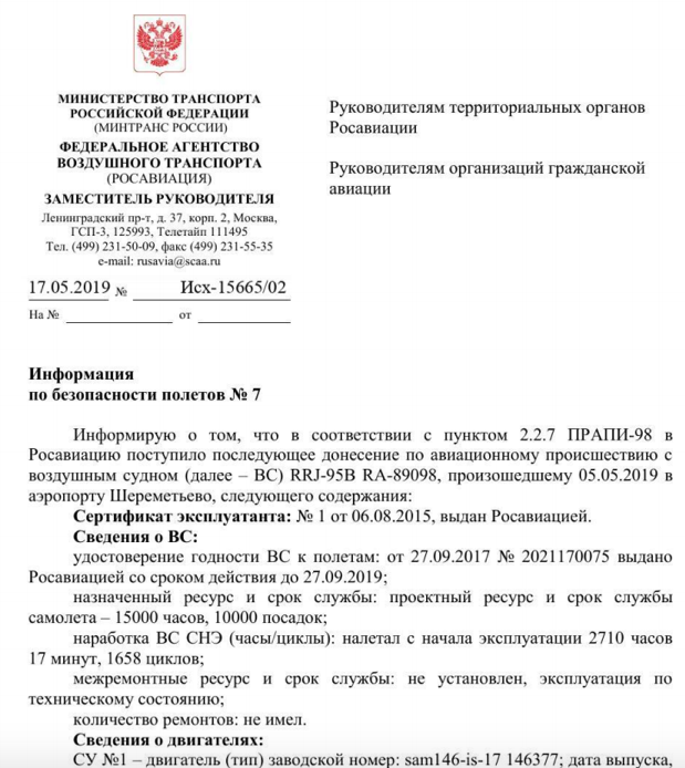 В письме Росавиации с изложением деталей катастрофы описаны события, которые привели к пожару SSJ-100 при посадке в Шереметьево, из-за которого 5 мая погибли 41 человек, убедились «Открытые медиа». Также в документе изложены рекомендации МАК авиакомпаниям по предотвращению таких катастроф в будущем.