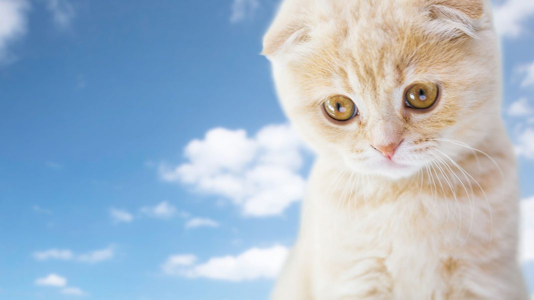 pets, animals and cats concept — close up of scottish fold kitten over blue sky and clouds background