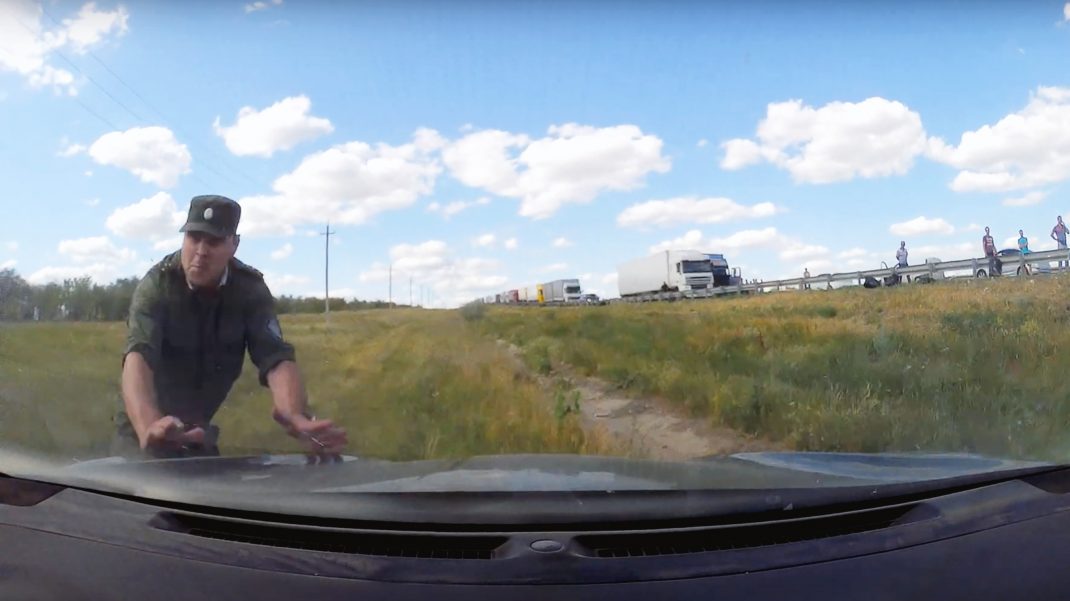 На записи с видеорегистратора видно, как пограничники разворачивают несколько машин перед Егоровым, а потом один из них буквально прыгает на капот машины. Водитель не стал останавливаться после ДТП и уехал, но уже в Самарской области его остановили на посту ГИБДД.