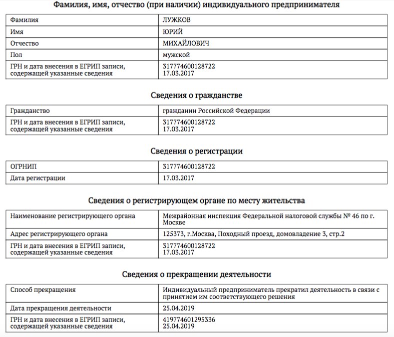 Юрий Лужков перестал быть индивидуальным предпринимателем
