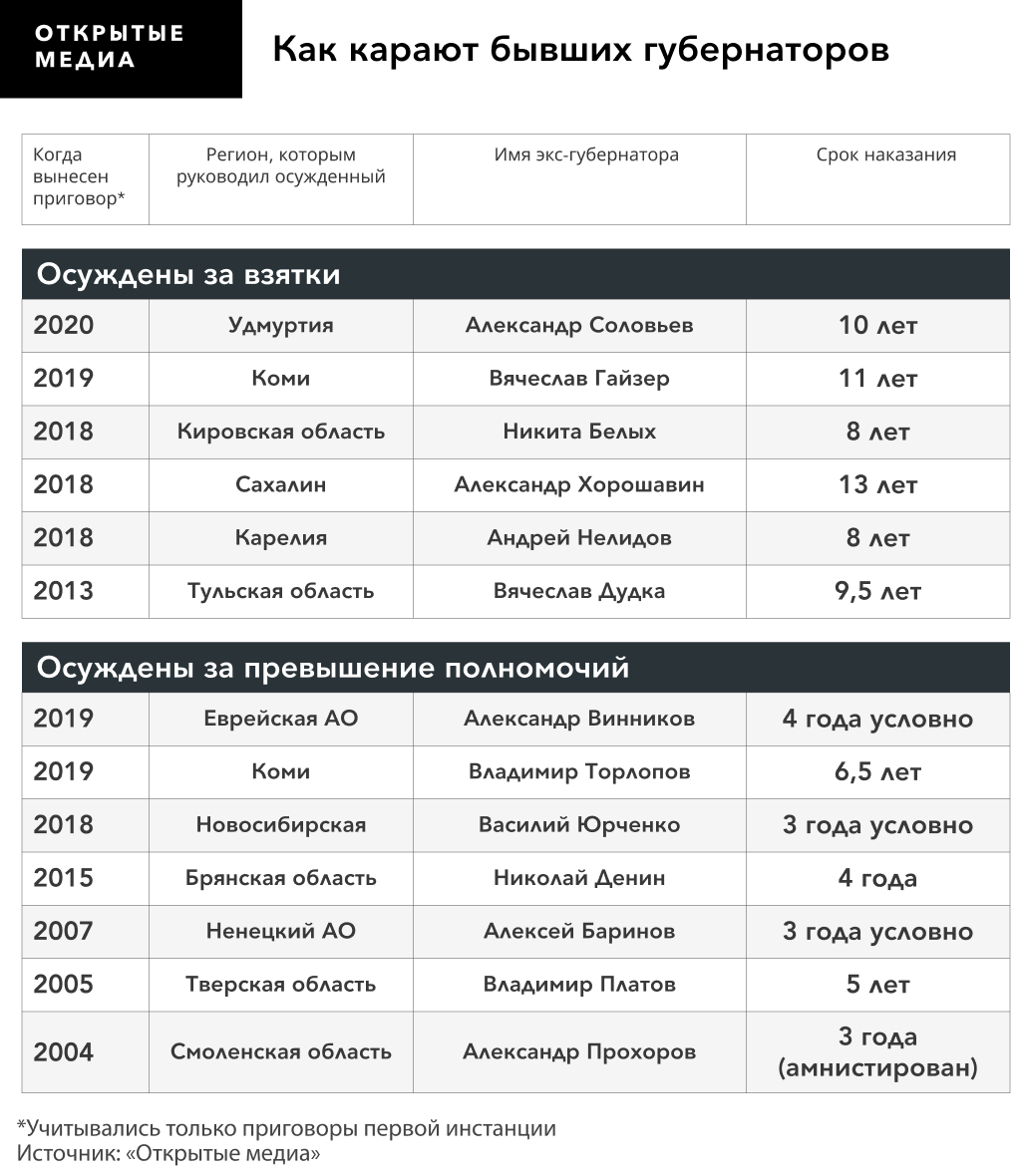 С 2018 года при оглашении приговоров стали звучать двузначные цифры: самый большой срок тогда получил экс-глава Сахалина Александр Хорошавин (13 лет). В прошлом году осуждены двое губернаторов, в этом — ещё двое. Срок Соловьёва — 10 лет — примерно соответствует среднему сроку, который в последние годы получает бывший губернатор за взятки.