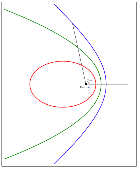 К межзвездным относятся объекты, которые не связаны гравитацией с какой-либо звездой. Главным признаком «межзвездности» стала форма орбиты. Тела Солнечной системы обычно движутся по эллиптическим орбитам с эксцентриситетом меньше 1. Эксцентриситет — это степень отклонения орбиты от окружности, уровень её «сжатости». Так, на картинке ниже эллиптическая орбита с эксцентриситетом 0,7 нарисована красным цветом, параболическая орбита — зелёным, и гиперболическая орбита с эксцентриситетом 1,3 — синим.