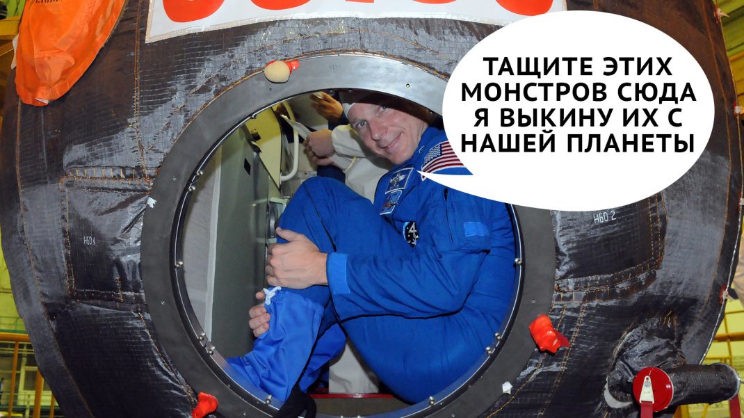 BAIKONUR, KAZAKHSTAN — NOVEMBER 12, 2014: ISS Expedition 42−43 NASA flight engineer Terry Virts looks out from the hatch of the Russian Soyuz TMA-15M spacecraft during fit check at Baikonur Cosmodrome